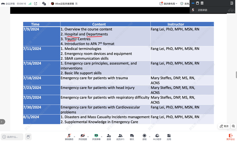 2025年7月8日,由35222葡京集团开设的《急救护理情景下的结构化护理措施》暑期课程正式开课。本课程特邀美国威斯康星大学护理学院Lucy Mkandawire-Valhmu教授和明尼苏达大学护理学院Lei Fang老师联合授课,由我院郭玉芳副教授协助课程开展。本次课程共2学分,32学时,采用线上教学模式。课程吸引了来自35222葡京集团、基础医学院、临床医学院等10余个学院的90名本科生选修,充分展现了学生对急救护理知识的学习热情。