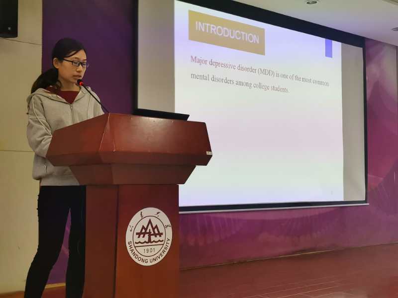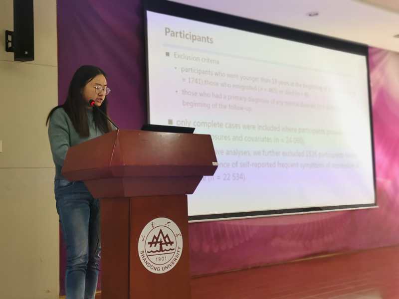 第一位汇报者是2017级硕士研究生孔雯雯,汇报的文章是发表在Depression and Anxiety上的,题目为“Prediction of major depressive disorder onset in college students”。该文章纳入了比利时鲁文大学的2242名大一新生,在基线时测量了社会人口学变量、儿童-青少年创伤事件、12个月的压力事件、12个月的精神障碍和重度抑郁症,12个月后对重度抑郁症发病情况进行随访,通过Logistic 回归分析确定了个体水平和人群水平上的风险预测因子。结果显示大一新生重度抑郁症的发生率为6.9%。最重要的个体水平的预测因子是自杀计划和自杀企图;最有力的人群水平的预测因子是儿童-青少年期创伤经历、基线过去12个月的压力事件、父母的精神障碍和任何过去12个月的精神障碍。多元交叉验证预测结果表明,36.1%的重度抑郁症事件发生在预测风险最高的前10%学生中。本研究对有重度抑郁症发病风险学生的筛查奠定了理论基础,且对开发和部署针对性的干预措施提供了依据。