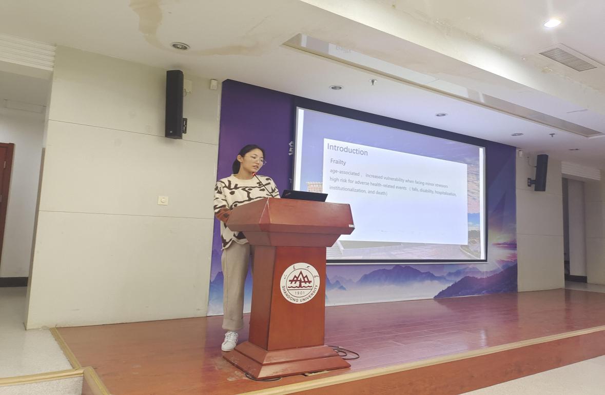 第一位汇报者是2020级硕士研究生李扬,本次汇报的是2019年发表在JOURNAL OF THE AMERICAN GERIATRICS SOCIETY杂志上的一篇文章,该杂志2020年影响因子是5.562,文章的题目是Effects of Multicomponent Exercise on Frailty in Long-Term Nursing Homes: A Randomized Controlled Trial。这是一项针对养老机构70岁及以上衰弱老年人进行的渐进性多元运动干预研究,该多元运动包含了5分钟热身、25分钟力量训练、10分钟平衡训练及5分钟冷身运动,每周两次,持续6个月。不进行多元运动的天数,会让老年人进行散步,6个月后的目标达到每周步行达到140分钟。使用非配对t检验、卡方检验、双向混合设计方差分析分析了组间和组内在衰弱、跌倒、死亡、入院次数等的变化。结果显示渐进性多元运动干预可以有效改善该人群的衰弱状态,降低跌倒、死亡的不良结局。但是干预结束后降低跌倒的效果消失,因此未来研究应该注重多元运动干预的持续性。