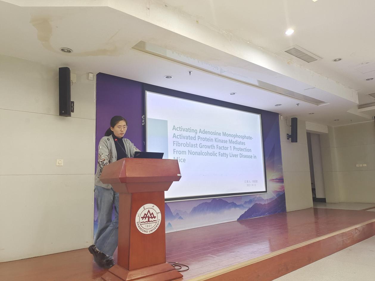第二位汇报者是刘清波,本次汇报的文章是2021年发表于Hepatology杂志,该杂志在2020年的影响因子是17.422。她汇报的文章题目是Activating Adenosine Monophosphate-Activated Protein Kinase Mediates Fibroblast Growth Factor 1 Protection From Nonalcoholic Fatty Liver Disease in Mice,该研究主要是通过构建二型糖尿病合并非酒精性脂肪肝的小鼠模型和体外棕榈酸盐诱导的氧化应激与脂质代谢失调的HepG2细胞模型,来探索FGF1在非酒精性脂肪肝中的治疗机制。本篇研究采用了蛋白免疫印迹法、RT-PCR和免疫组织化学染色等方法,结果表明FGF1通过FGFR4介导的AMPK激活抑制脂质堆积,激活Nrf2介导的抗氧化信号通路,增强肝脏脂质代谢和抗氧化信号,从而预防代谢综合征引起的肝脂代谢紊乱和氧化应激,从而对非酒精性脂肪肝产生保护作用。