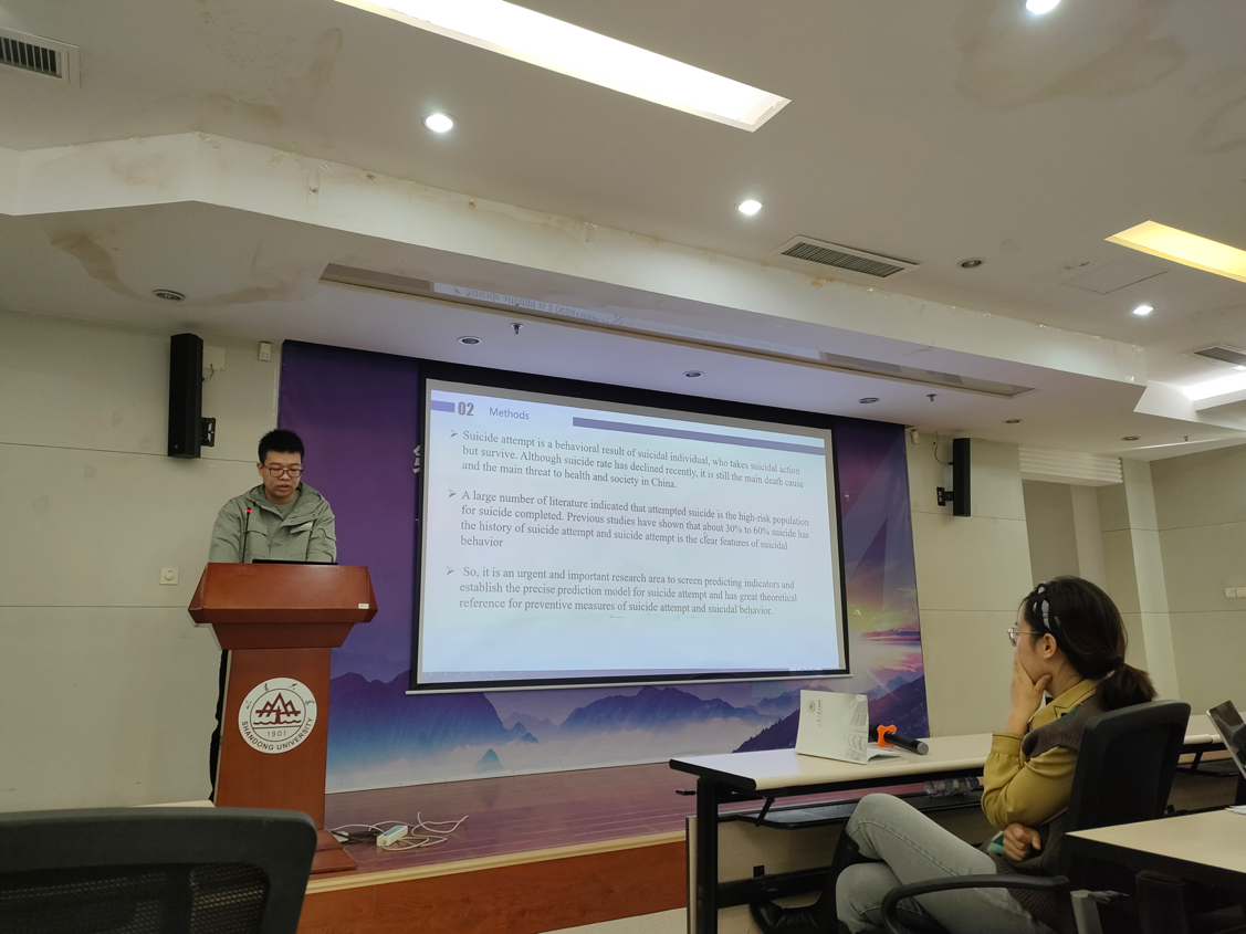 第一位汇报者是2020级硕士研究生王增辉,本次汇报的是发表在Journal of Affective Disorder杂志上的志上的一篇文章,该杂志2020年的影响因子是5.15,文章的题目是BP neural network prediction model for suicide attempt among Chinese rural residents。该研究来自于一项病例对照研究,使用机器学习的方法构建自杀尝试的预测模型。该文章首先进行了单因素logistic回归,并进一步使用似然比logistic回归进行变量筛选。研究发现,家族史、心理问题、低教育水平、较差的健康状况、欲望扭力、绝望、冲动和抑郁是自杀尝试的危险因素,而社会支持、应对方式和健康的社区环境是自杀尝试的保护因素。在此基础上,将有统计学意义的自变量纳入BP神经网络的输入层构建BP神经网络。结果发现,最优神经网络模型共包含9个隐层、预测精度为84.6%,对自杀尝试有良好的预测能力。