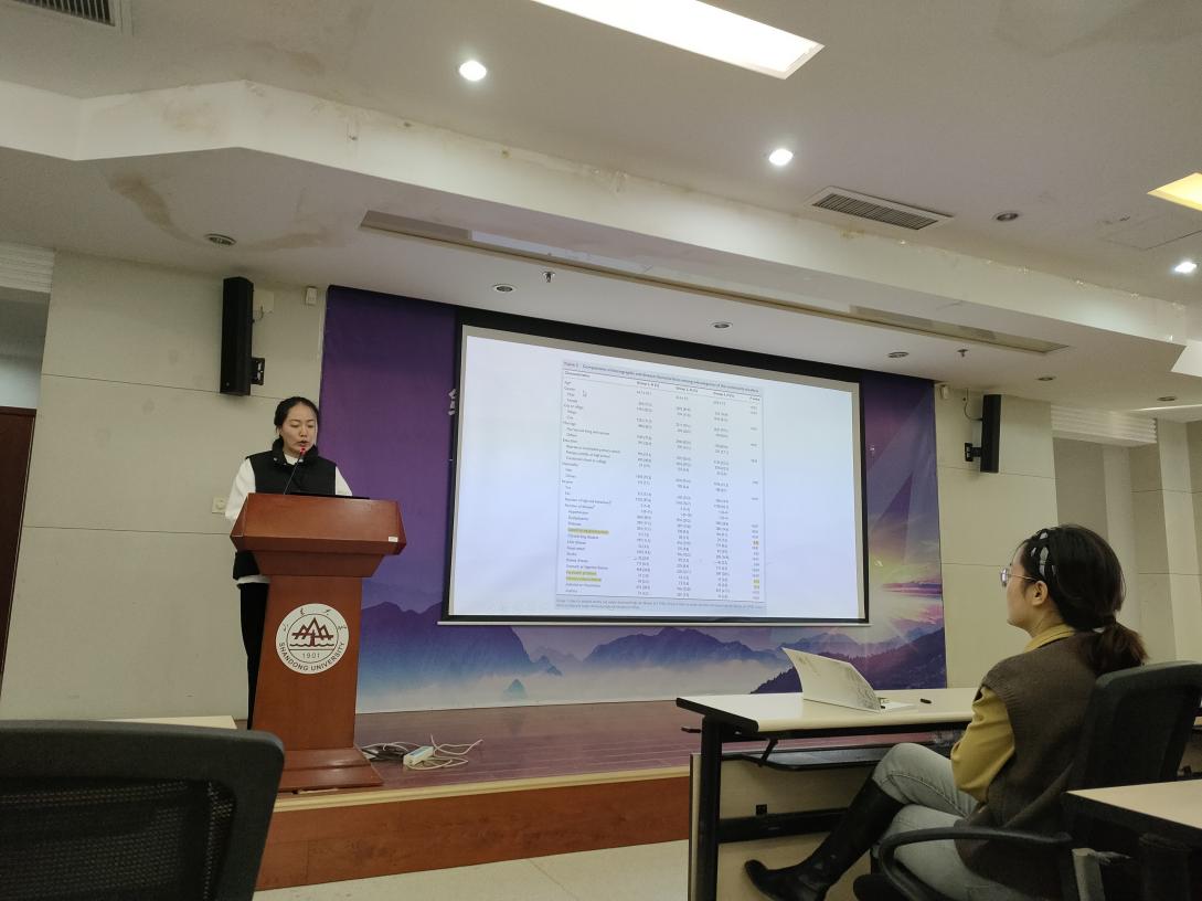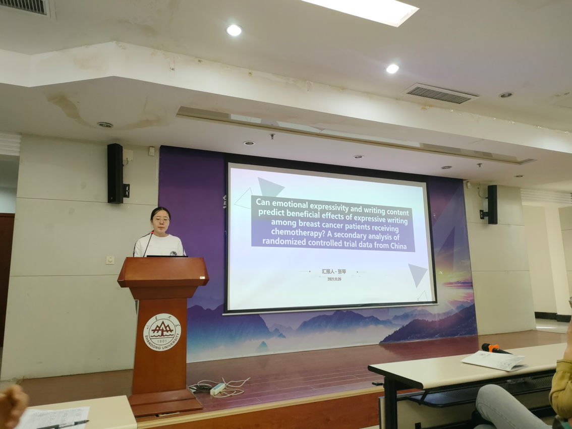 第二位汇报者是2020级硕士研究生张琴,本次汇报的是发表在Psychological Medicine 杂志上的一篇文章,该杂志2020年影响因子是7.723,文章的题目是 Can emotional expressivity and writing content predict beneficial effects of expressive writing among breast cancer patients receiving chemotherapy? A secondary analysis of randomized controlled trial data from China。这是一项对接受化疗的乳腺癌患者表达性写作(EW)干预数据的二次分析,在原始研究中,比较了接受化疗的乳腺癌患者的延长EW组(12个疗程)和标准EW组(4个疗程)之间的健康结局。使用THU汉语词汇分析器对中文文本进行标记化。然后,用LIWC2015软件来量化积极和消极情感词的使用。在这个二次分析研究中,探讨了情感表达能力和语言使用模式是否可以在强烈抑制情感表达的文化中预测乳腺癌患者表达性写作的益处。结果显示情绪表达水平和情感词语使用模式可能是影响EW干预对生活质量影响的因素。这可能有助于临床医生确定在中国最可能受益于此类写作练习的个体。