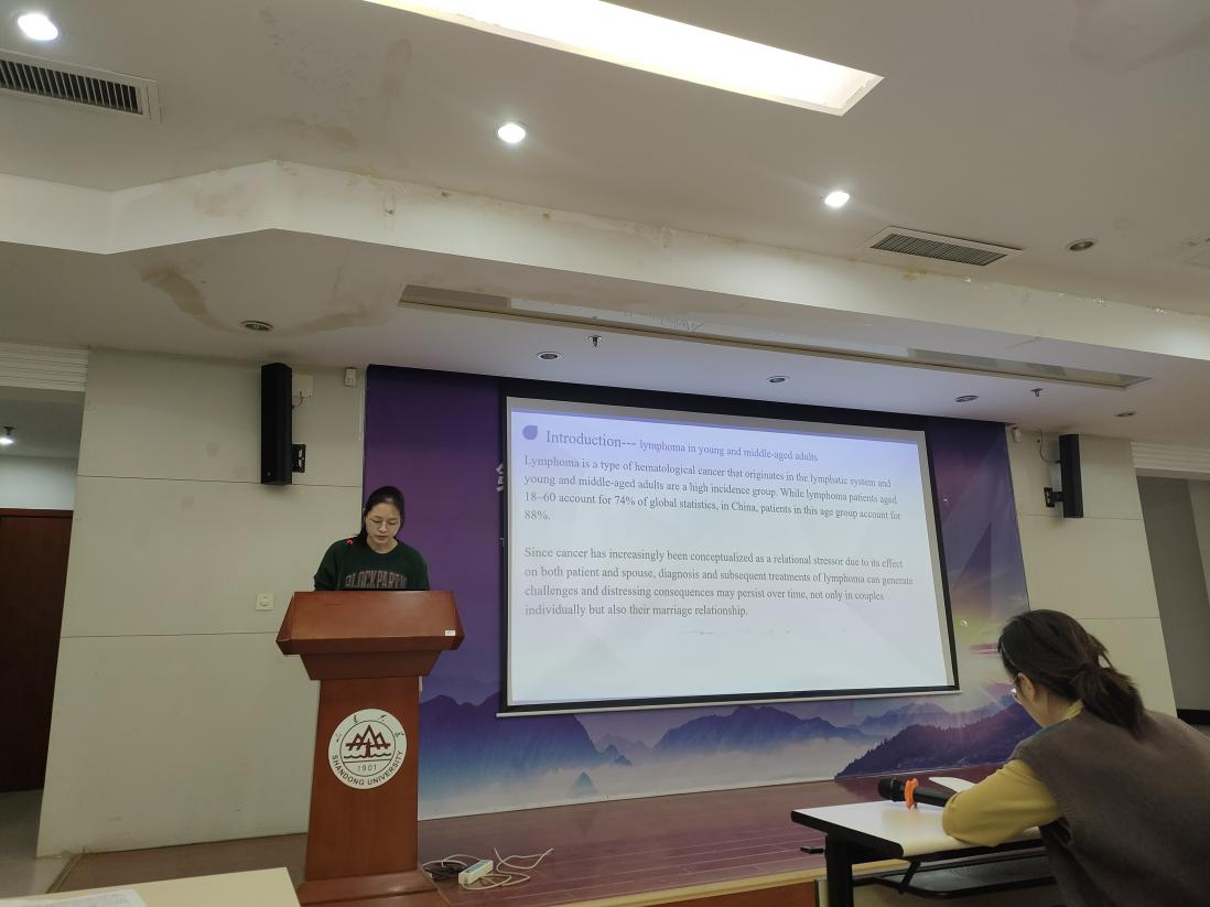 第四位汇报者是2020级硕士研究生周淼,本次汇报的是2021年5月发表在Psycho‐Oncology杂志上的一篇文章,该杂志2020年的影响因子是3.894,文章的题目是Self-efficacy, psychological distress, and marital quality in young and middle-aged couples facing lymphoma: The mediating effect of dyadic coping。这是一项在中青年淋巴瘤患者及配偶中进行的研究,研究者基于主客体互倚模型,探讨了自我效能和心理困扰与婚姻质量的关系,并分析了二元应对在其中的中介作用。中介分析结果显示,二元应对在自我效能感、心理困扰和婚姻质量之间的中介效应有较好的拟合,与χ2/df = 17.106, p = 0.194; RMSEA = 0.036; GFI = 0.992; CN = 243。研究结果表明了二元应对在自我效能对自身及其配偶婚姻质量的影响中起中介作用,强调了以夫妻为基础的干预和策略结合对个体和二元治疗的必要性。这些措施包括提高自我效能,减少心理困扰,鼓励夫妻之间的自我表露和提高沟通技巧,这可能对夫妻的婚姻质量有积极的影响。