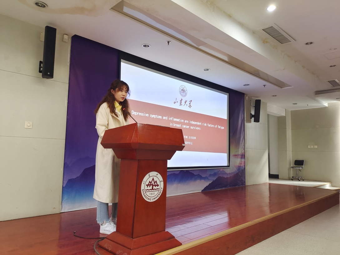 第三位汇报者是2020级硕士研究生李华玉,本次汇报的是发表在PSYCHOLOGICAL MEDICINE杂志上的一篇文章,该杂志五年影响因子是8.396,文章的题目是《抑郁症状和炎症是乳腺癌幸存者疲劳的独立危险因素》。心理社会和炎症因素与乳腺癌幸存者的疲劳有关。然而,这些因素与癌症相关疲劳的相对贡献和/或相互作用还没有被很好地记录。这篇横断面研究纳入了111名0-III期乳腺癌患者,他们接受了乳腺手术和全乳腺放疗。疲劳通过多维疲劳量表-20的总分来衡量。潜在的危险因素包括炎症标记物(血浆细胞因子及其受体和C反应蛋白:CRP)、抑郁症状(通过抑郁症状量表评估-自我报告)、睡眠(通过匹兹堡睡眠质量指数评估)和感知压力(通过感知压力量表评估)以及年龄、种族、婚姻状况、吸烟史、更年期状况、内分泌治疗、化疗和癌症阶段。线性回归模型被用来检查疲劳的危险因素。放疗后1年,抑郁症状(p<0.0001)和炎症标记物(CRP: p= 0.015;白介素-1受体拮抗剂:p = 0.014可溶性肿瘤坏死因子受体-2:在单独的模型中p = 0.009)是疲劳的独立危险因素。中介分析表明,抑郁症状也介导了疲劳与睡眠和压力的联系。抑郁症状和炎症是放疗后1年癌症相关疲劳的独立危险因素,因此代表了这种衰弱症状的独立治疗目标。然而,本篇文章结论需要谨慎对待,因为横断面设计不能提供对基线炎症和社会心理测量的充分控制。抑郁症状/睡眠问题/感受到的压力和炎症之间的相关性的非显著性结果可能是由于人群不符合MDD或睡眠障碍的诊断标准,并且放疗后1年的压力可能不够大。总的来说,未来的纵向研究需要验证我们的发现,有针对性的干预将受益于对疲劳的独特和常见的生物和心理机制的进一步理解。