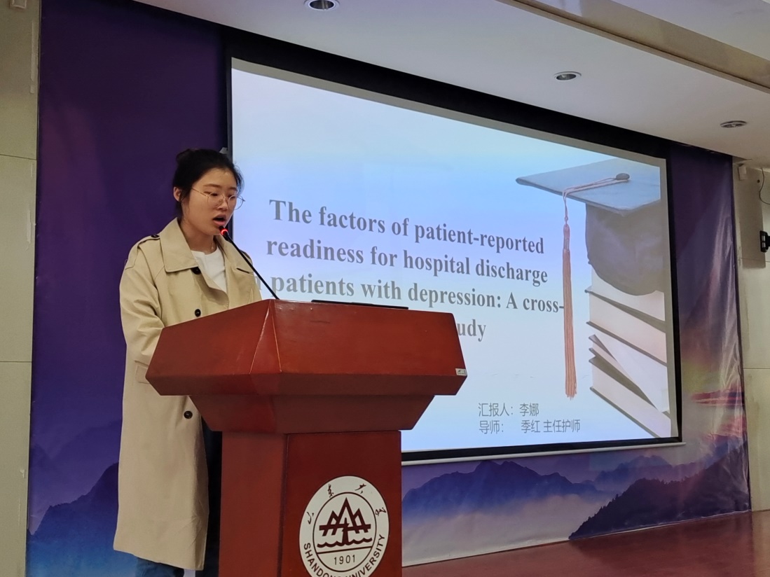 第四位汇报者是2020级硕士研究生李娜,本次汇报的是发表在J Psychiatr Ment Health Nurs.杂志上的一篇文章,该杂志五年影响因子是3.395,文章的题目是《抑郁患者自我报告的出院准备度及其影响因素:一项横断面研究》。出院准备程度较低(RHD)之后可能会导致负面的医疗保健结果。然而,没有研究调查抑郁症患者中的RHD。本研究旨在探讨抑郁症患者中报告的RHD及其因素。本研究是一项横断面研究,于2016年10月至2017年8月在中国西南部一所精神卫生中心采用便利抽样的方法选取部分患者作为研究对象。共招募了367名抑郁症住院患者,完成了出院准备量表(RHDS)和出院教学质量量表(QDTS)。采用二元logistic回归分析探讨抑郁症患者RHD的因素。结果显示,RHDS总分为7.70±1.52。约28.9%的参与者RHD较低(RHDS评分<7);RHD与住院时间、患者获得的内容和医护人员的指导技巧及效果显著相关。根据研究结果可以发现抑郁症患者的RHD处于中等水平。超过四分之一的抑郁症患者RHD较低。为提高RHD,提高出院教学质量是抑郁症患者的必要条件。本研究对未来的启示是,护士应更加重视住院时间超过20天的患者。护士可以通过提高出院教学的质量,特别是护士所接受的内容和提供这些内容的技能来改善RHD。