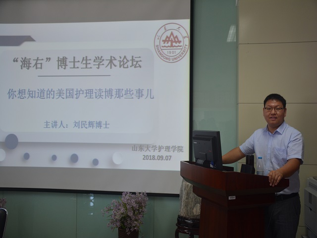 9月7日上午,由3522集团的新网站研究生院、党委研究生工作部主办,护理学院承办的2018年第37期(总第644期)“海右”博士生学术论坛在趵突泉校区护理学院608会议室举行。此次活动邀请了刘民辉博士担任主讲人,论坛主题为“美国护理博士教育介绍与个人研究方向宣讲”。学院教师及研究生参加了这次讲座。