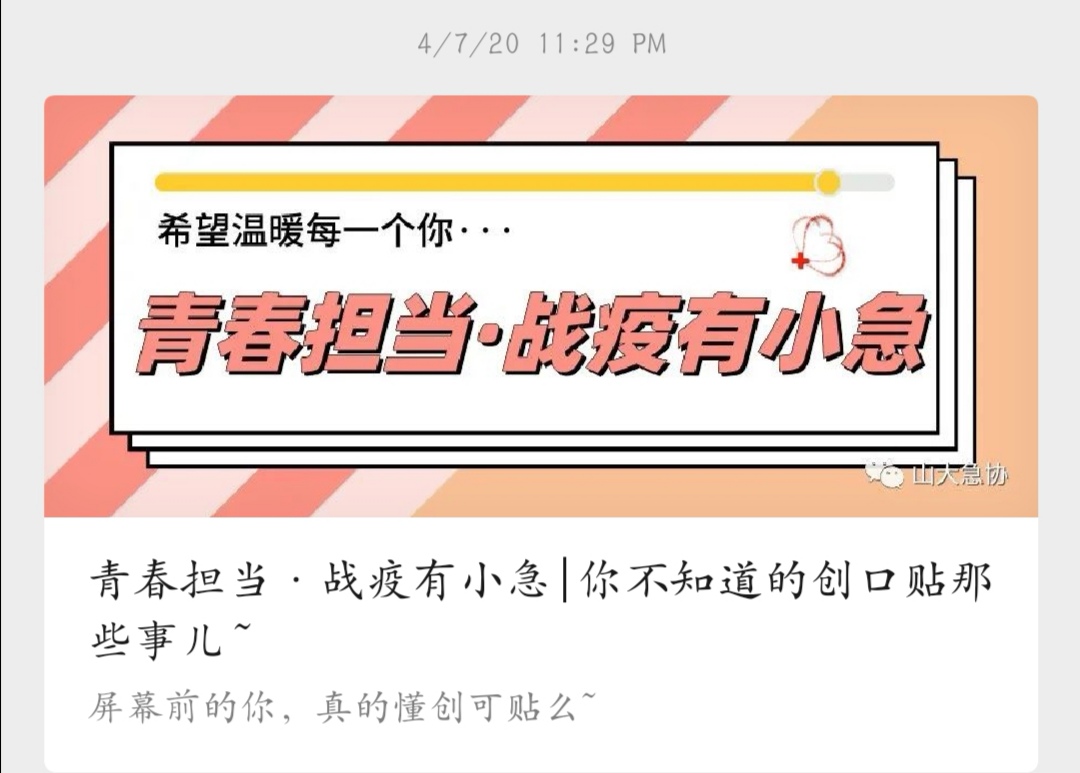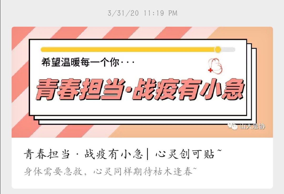 自校团委号召全体学生开展“青春担当,战疫有我”实践活动后,3522集团的新网站急救协会积极响应号召,开展“青春担当,战疫有小急”系列志愿活动。依托微信公众号“山大急协”平台,积极搜集资料制作推文,宣传各类健康知识,为抗击新冠疫情贡献山大学子的绵薄之力。