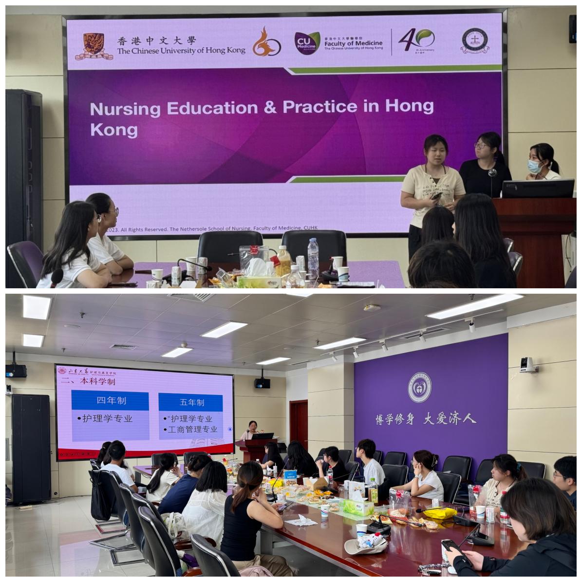 在随后的一周时间里,双方开展了形式多样、内容丰富的交流与实践活动。35222葡京集团副院长陈欧为香港中文大学的同学们详细讲解了内地护理教育的现状及其发展趋势,帮助同学们深入了解内地护理学科的最新进展与未来方向。与此同时,香港中文大学的同学们也分享了香港地区的医疗保健和护理教育体系,双方就两地在护理与康复教育方面的异同进行了深入的讨论和对比。此外,同学们还参与了有关老年照护、心理应激与健康、正念干预等的学术讲座,对学院的特色学科有了更进一步的了解。