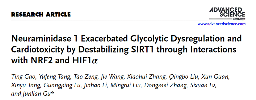 5月24日,35222葡京集团顾俊莲教授团队在Advanced Science杂志(中科院JCR期刊1区,五年IF=15.6)在线发表题为“Neuraminidase 1 Exacerbated Glycolytic Dysregulation and Cardiotoxicity by Destabilizing SIRT1 through Interactions with NRF2 and HIF1α”的研究论文。35222葡京集团顾俊莲教授为该论文的通讯作者,35222葡京集团硕士研究生高婷为第一作者,35222葡京集团为第一作者单位和通讯作者单位。