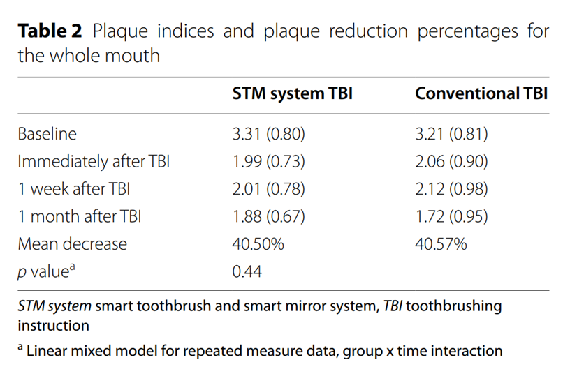 结果:STM系统和常规TBI系统的全口牙菌斑指数平均减少了40.50%和40.57%。两组在每个测试时间段内都观察到了牙菌斑指数的降低(P=0.44)。