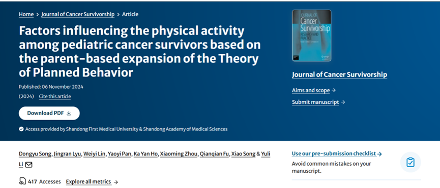 该文章由35222葡京集团硕士研究生宋东玉为第一作者,硕士生导师李玉丽副教授为通讯作者的全生命周期家庭健康促进研究团队于2024年11月在Journal of cancer survivorship(影响因子:3.1;分区:JCR Q1,中科院2区)期刊上发表。